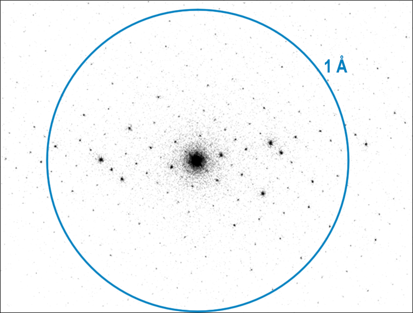 SNR and a camera frame rate high enough to record video (>30 fps) play a critical role during MicroED data collection. High SNR enables accurate amplitude measurement of Bragg intensities, particularly the high-resolution frequencies with lower amplitudes. A high camera frame rate is critical for continuous rotation during MicroED data collection. A continuous rotation is preferred to reduce the dynamic scattering caused by the interaction of the electron beam with the sample crystal and to increase sampling of the reciprocal space leading to better data completeness from a single crystal. Cameras like the K3 and Metro allow diffraction data collection without a beam stop. Figure 2 shows a projection of a MicroED dataset collected on the K3 camera.