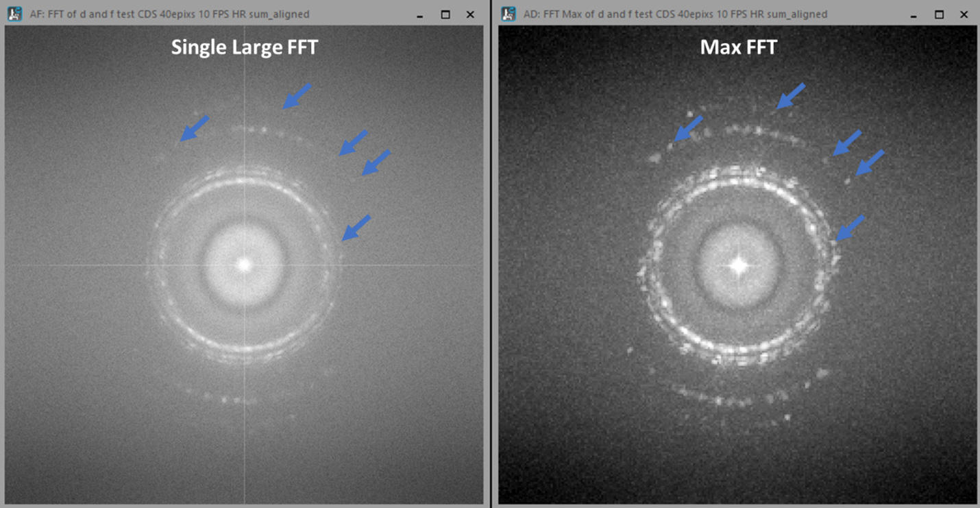 The following script (Live Max FFT) produces something like a diffractogram rather than a new real-space image, as shown in Figure 1D. Rather than simply performing a live fast Fourier transform (FFT) of the image, as DigitalMicrograph can already do easily, this script computes a “maximum FFT.” It does this by first dividing the image into many small regions and computing FFTs for each. Then instead of summing or averaging over all those FFTs, it finds the maximum so that each pixel in the result is the maximum over all the computed FFTs. The effect of this is to increase the signal from small crystalline regions which might otherwise be lost in the background intensity of a single large FFT, as shown in Figure 2, while decreasing the pixel resolution of the FFT.