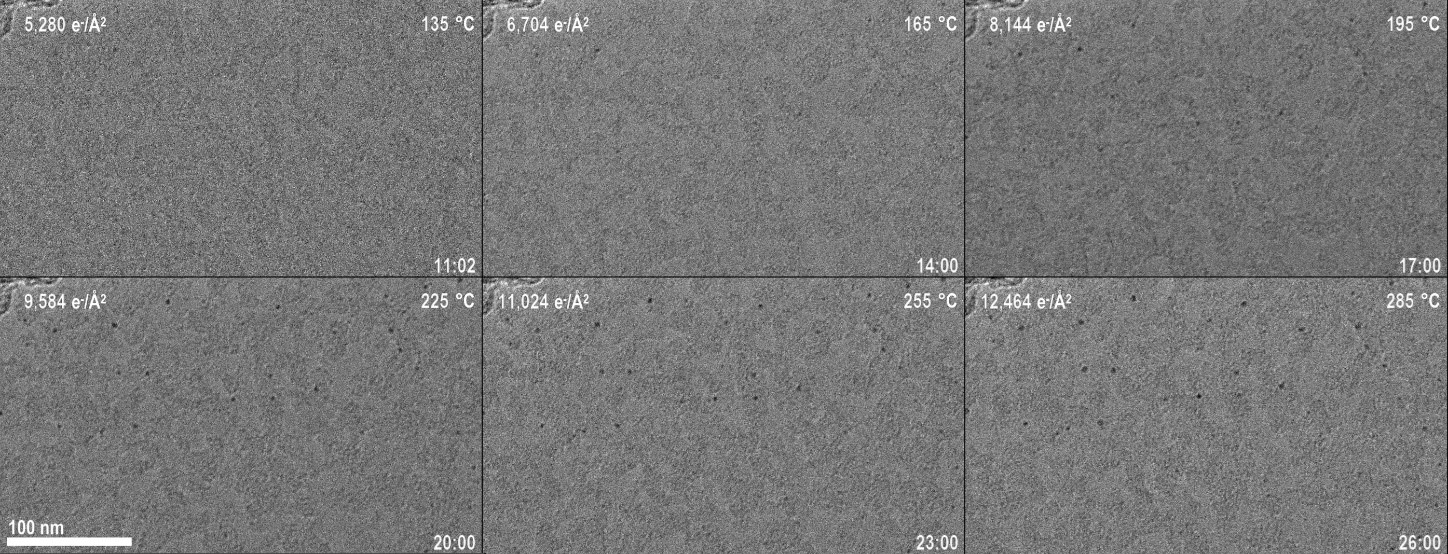 K3 IS カメラ内部では 1500 フレーム毎秒でデータが取得され電子カウンティング処理が行われていますが、ストレージに保存されているオリジナルのビデオのフレームレートは 5 フレーム毎秒(fps)です。観察を開始してからの 11 分間は特に変化が無く処理は行っていませんが、残りのデータセットは 4913 フレームあり、各フレームは 5760 x 4092 ピクセルを有していることから総データサイズは 107 GBに達します。データ取得後、データは x4 のビニング処理を行った上でドリフト補正、切り取りを行い、さらに 10 枚のフレームを合算することで最終的なビデオデータを生成しています。結果として、492 フレーム、812 x 444 ピクセル、総データサイズが 790 MBのdm4フォーマットのデータが作成されました。DigitalMicrograph® をデータの処理に使用し、この処理済みのデータセットに対してmp4フォーマットのビデオを出力しました。そのデータサイズは僅か 93 MBです(データサイズとしては 99.9 % の圧縮を達成しています)。このビデオから得られたいくつかのフレームを図1に示しています。動画の完全版をご覧になりたい方は こちら をクリックしてください。